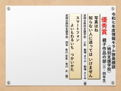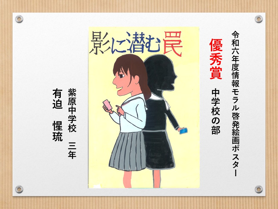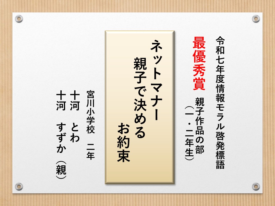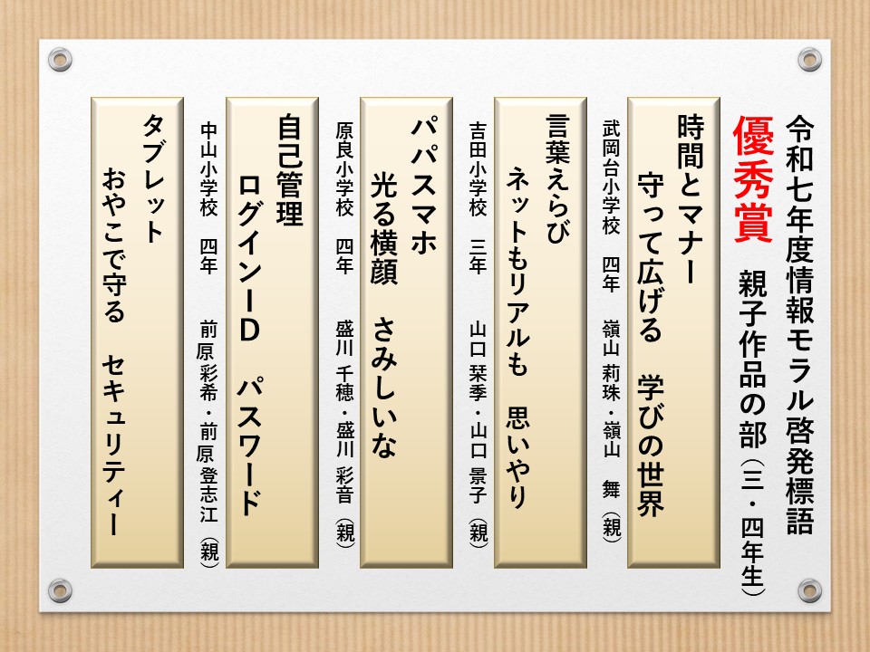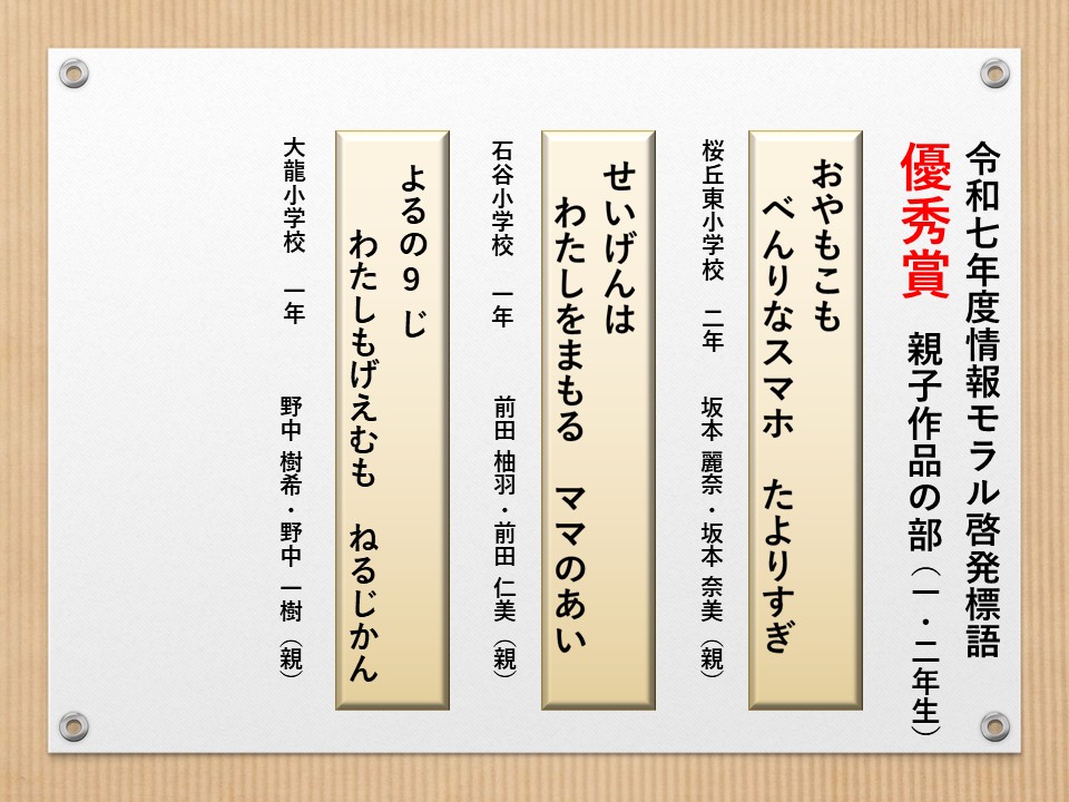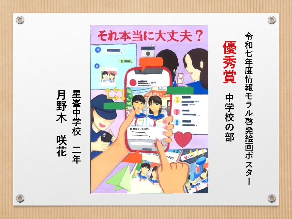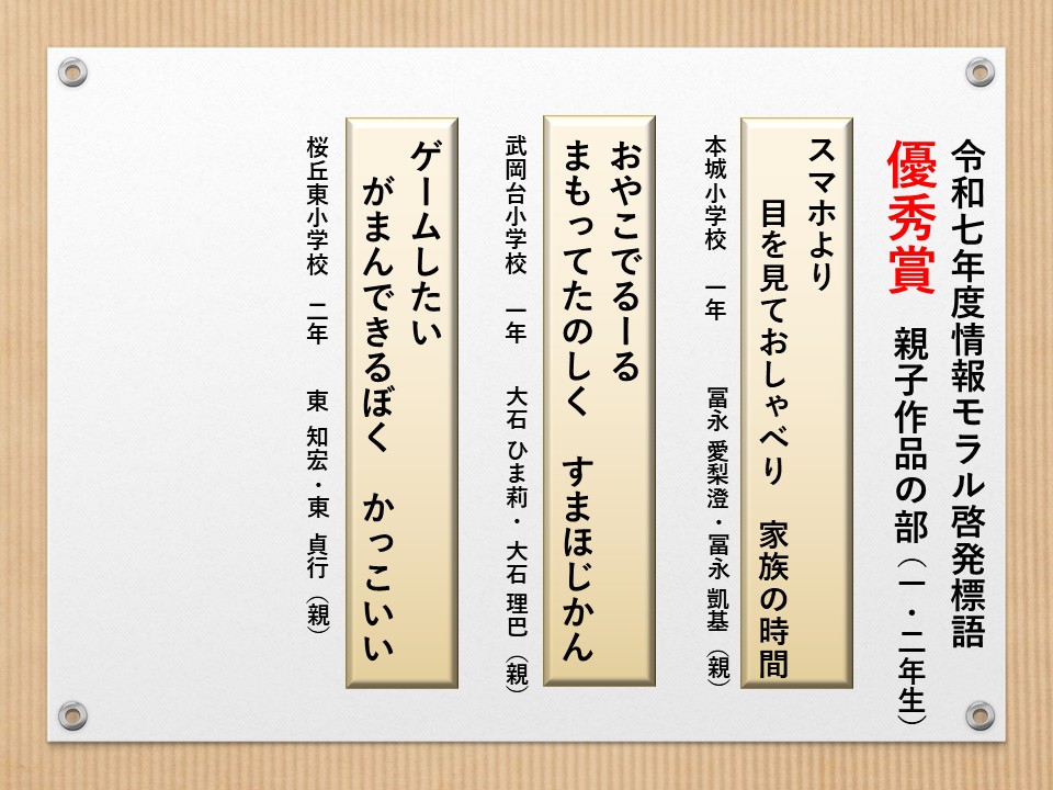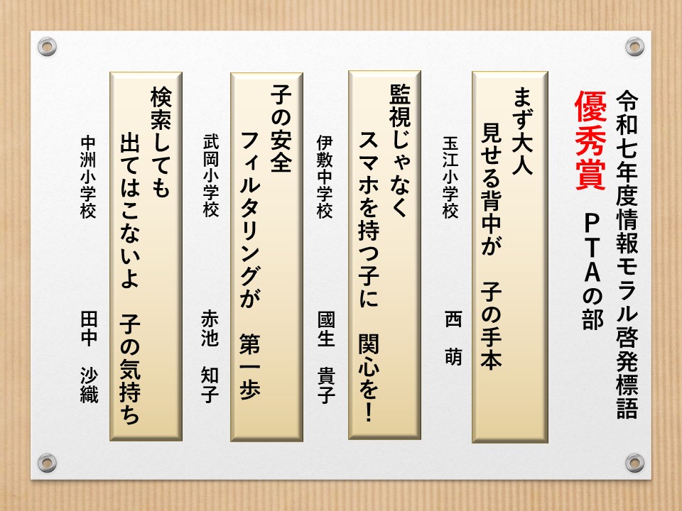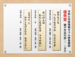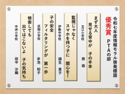 最後に皆様方の作品を通して、これからの生活において情報モラルについて親子で考え 語り合う機会が増え、家庭教育の充実に繋がればと願っております。