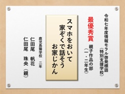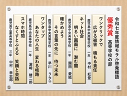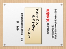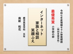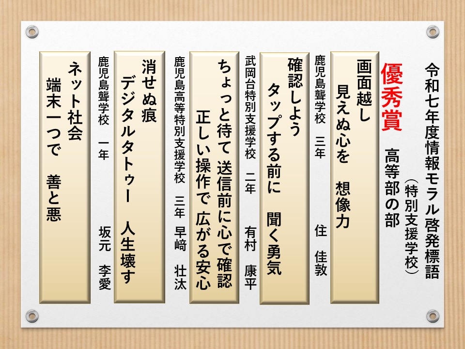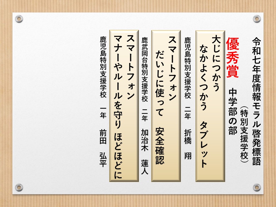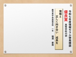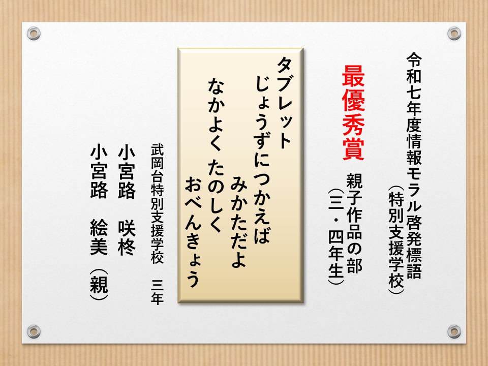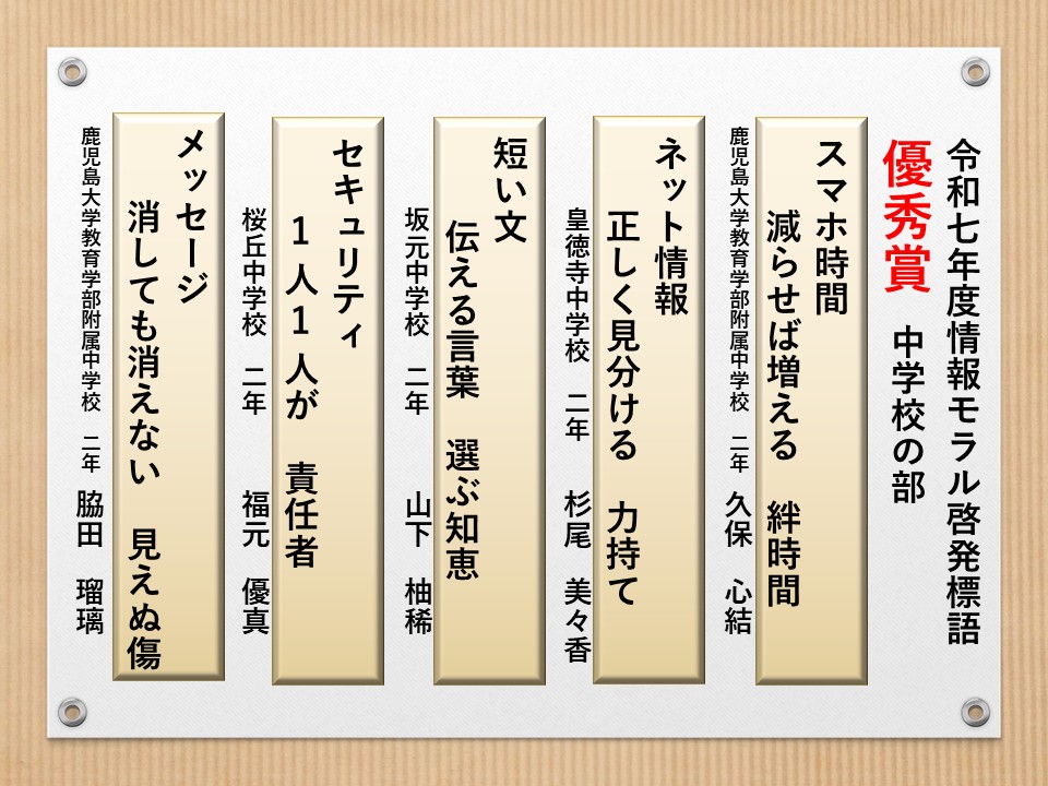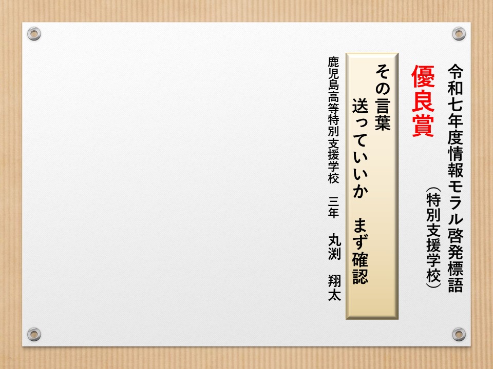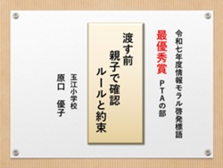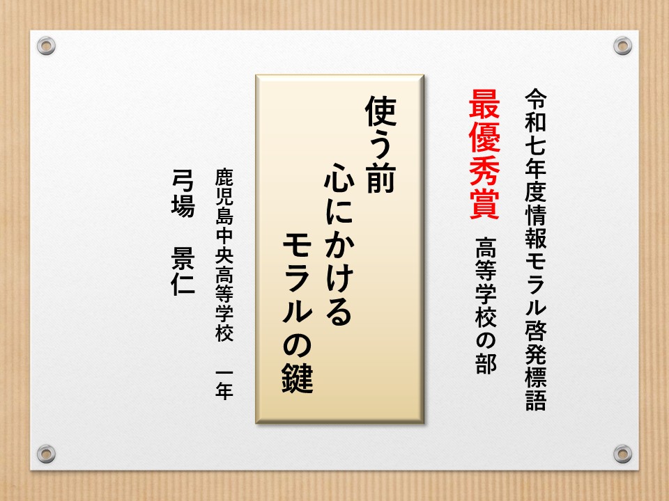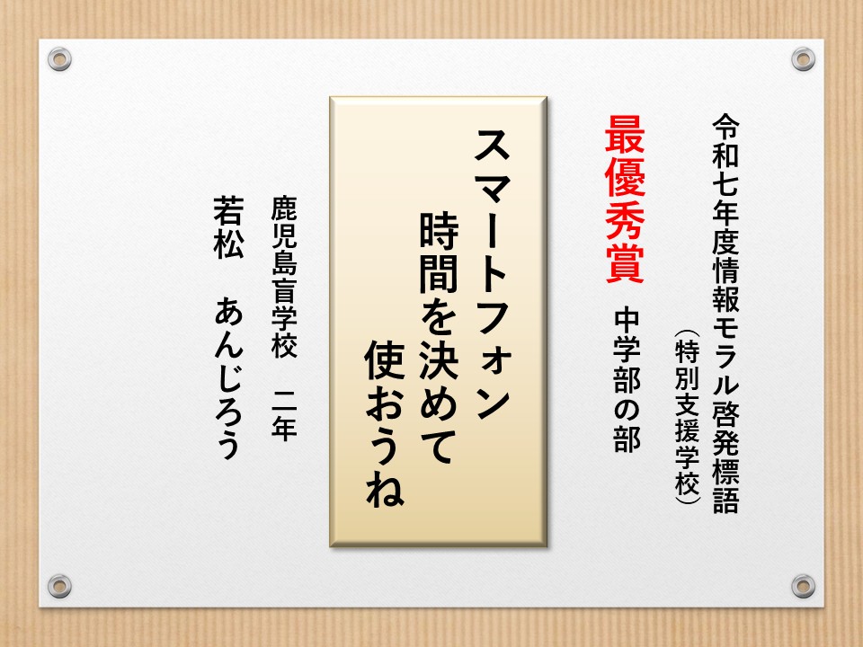 最後に皆様方の作品を通して、これからの生活において情報モラルについて親子で考え 語り合う機会が増え、家庭教育の充実に繋がればと願っております。